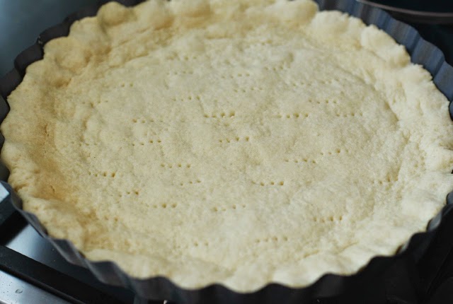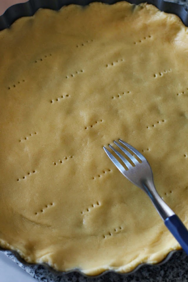 Enmantequillar una fuente redonda para horno (de aprox 30 cm de diámetro) y distribuimos la masa en el fondo de manera homogénea. Pinchar con un tenedor para que la masa respire en el horno. Yo reserve un poco de masa para decorar luego con tiras la superficie del Kuchen, esto es totalmente opcional.