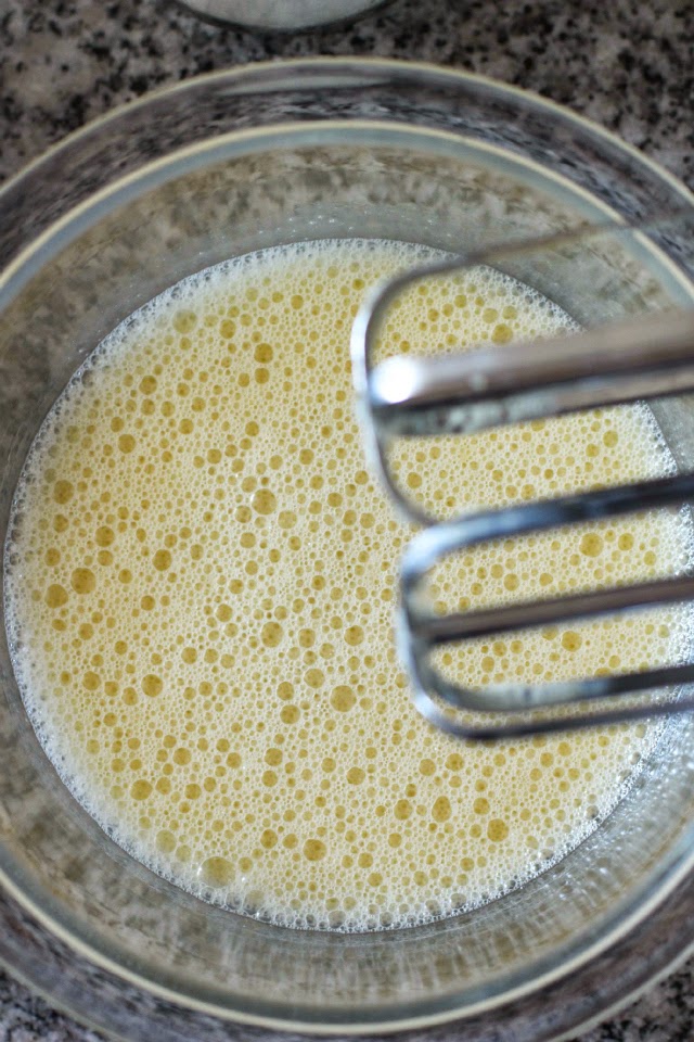 Partimos con la masa: En un recipiente o bowl mediano batimos los 2 huevos hasta que estén espumosos y agregamos ½ taza de azúcar y 125 gr de mantequilla derretida, mezclamos todo muy bien.
