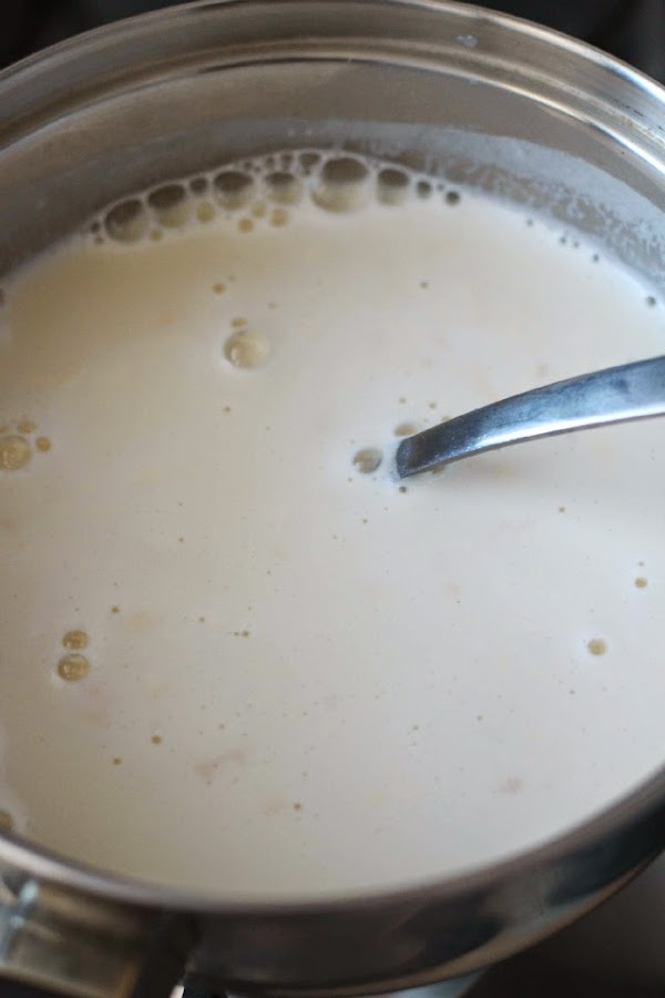 Mientras la masa está en el horno podemos avanzar con el relleno. En una olla mediana agregamos 1 taza y ½ de leche, 200 cc de crema de leche y 1 cucharadita de esencia de vainilla. Llevamos a ebullición. Luego de que la mezcla hierva agregamos inmediatamente 4 cucharaditas de maicena disuelta en agua y revolvemos por un par de minutos más hasta lograr una consistencia pseudo cremosa, dejamos entibiar un par de minutos.