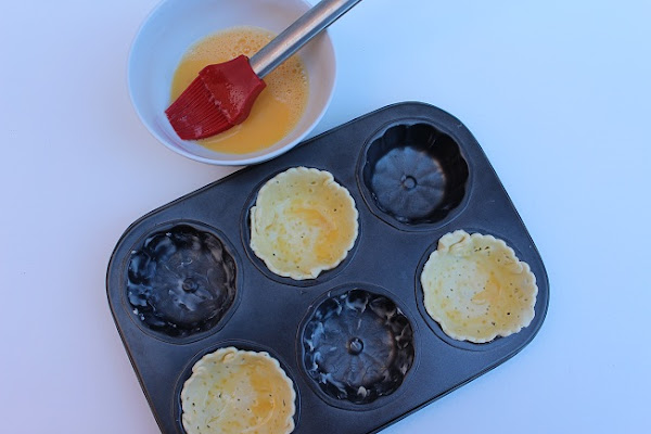 Colocamos cada corte redondo del hojaldre en un hueco del molde. Los pinchamos con el tenedor para que la pasta no suba y los untamos de huevo batido con el pincel para que se dore. Yo acostumbro, además, a rellenar la pasta con un puñado de garbanzos. Esto asegura que no suba. De todas formas, en esta ocasión no lo he hecho, y he tenido que pinchar la base de la pasta horneándose en varias ocasiones. Hacedlo con mucho cuidado de no quemaros y de no romper la lámina de hojaldre.