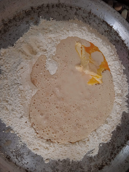 1.- En un recipiente coloca la leche tibia, agrega la levadura, una cucharada de azúcar 3 cucharadas de harina. Revuelve bien y dejar reposar durante 15 minutos hasta que la levadura fermente.
