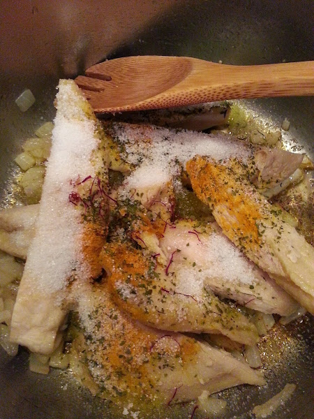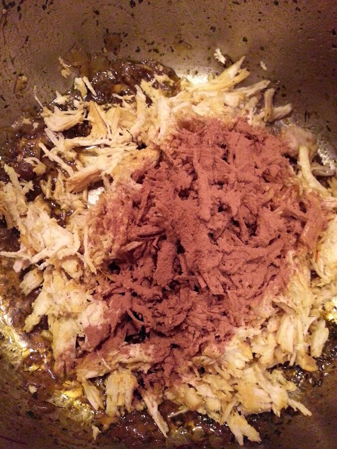 - Ponemos en una cazuela con un poco de aceite a regohar el pollo con la cebolla picadita y todas las especies menos la canela y el caldo de pollo.