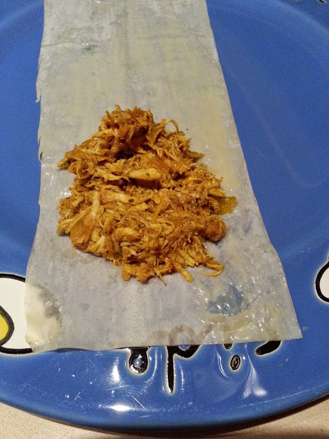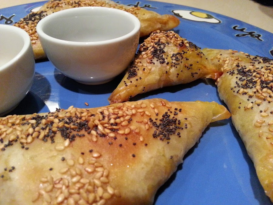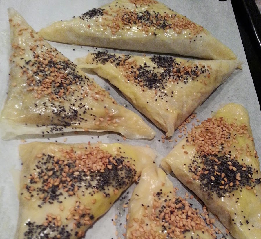 - Cortamos las hojas de pasta filo en tiras y ponemos un poco de mantequilla pincelada alrededor para que quede bien cerrado cada triángulo.