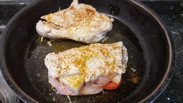 Cuarto paso: Salpimentamos la pechuga y ya podemos poner los ingredientes dentro, primero el queso y encima ponemos el tomate o si decidiste otros ingredientes pues los quesean, no pongas muchos ya que si no te costara cerrarlo una barbaridad.