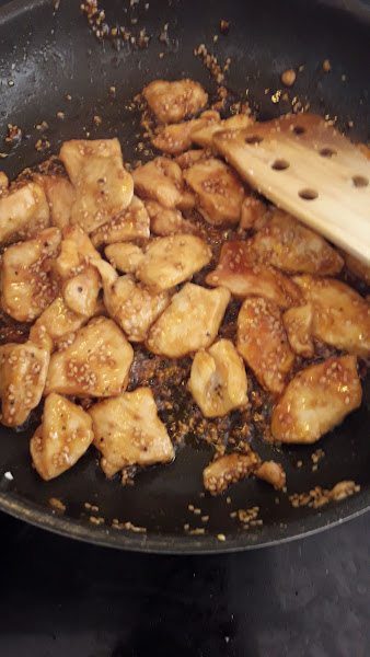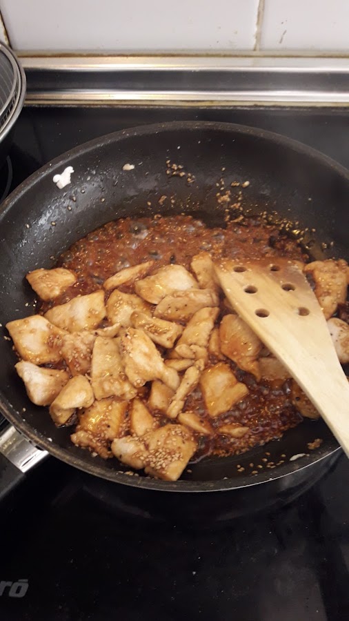 Una vez que esté bien hecho, le echamos la salsa y lo removemos todo bien para que todos los trozos de pollo se cubran con dicha salsa. La dejamos reducir un poco a baja potencia y cuando veamos que no queda demasiada y que el pollo está bien cubierto por ella, retiramos.
