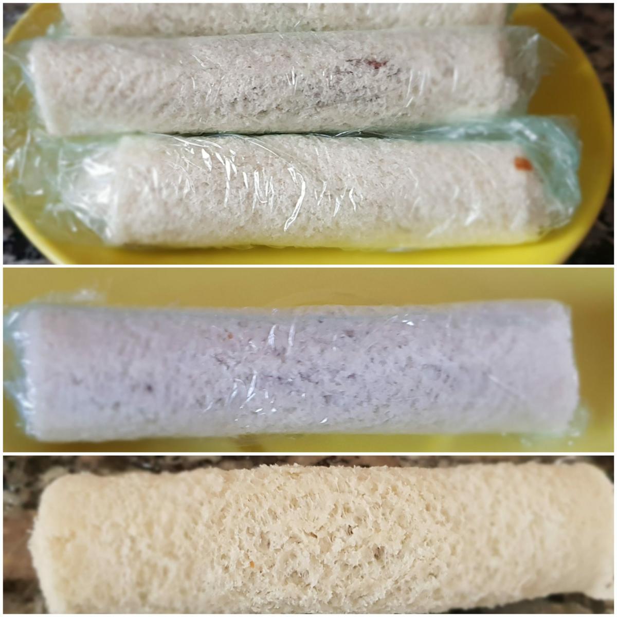 Preparación de los rollitos: Retiramos los bordes a las rebanadas de pan de molde, y con la ayuda de un rodillo aplanamos y estiramos un poco el pan.