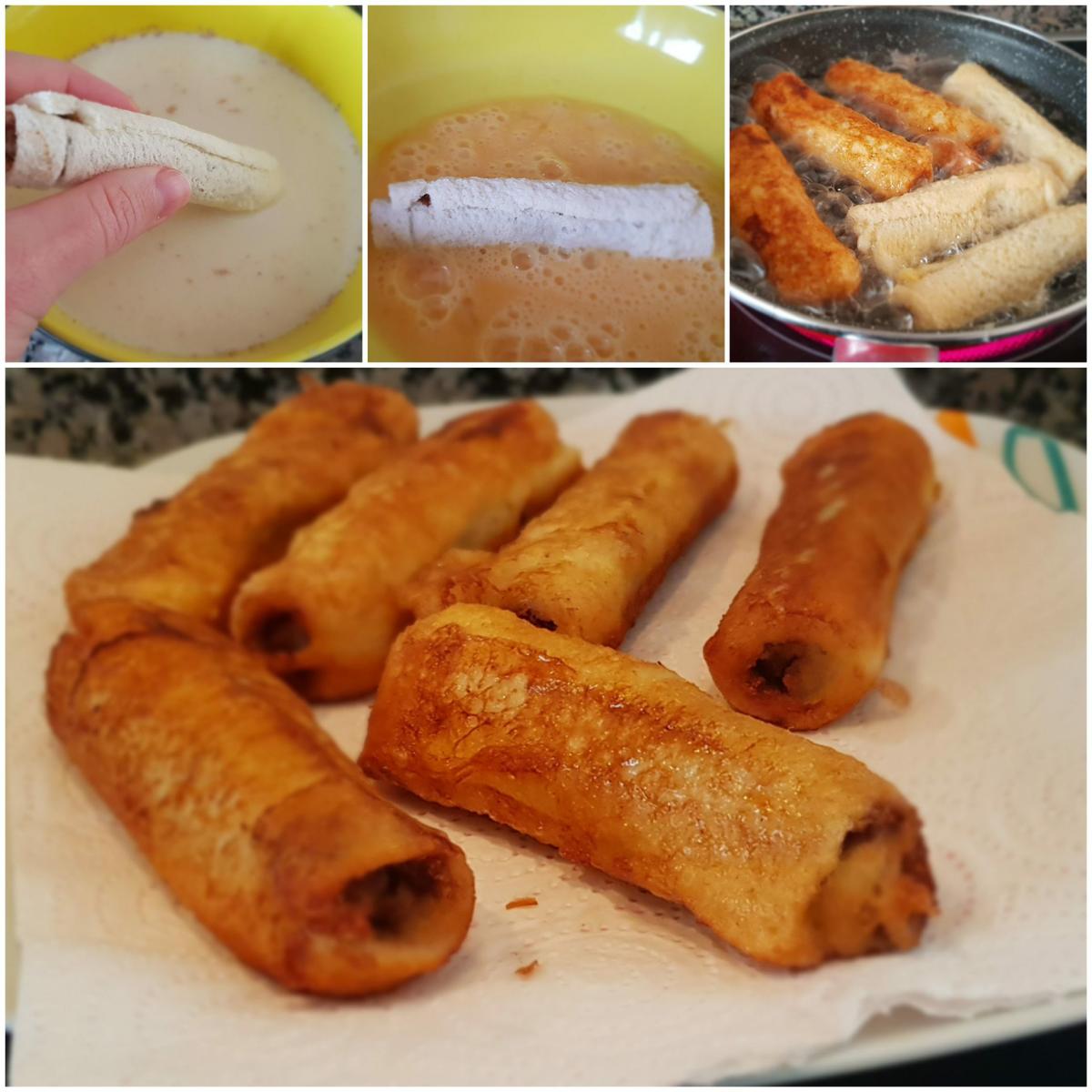 Ahora sacamos nuestros rollitos de la nevera, les quitamos el film y los pasamos por la leche y luego por el huevo, y a la sartén!