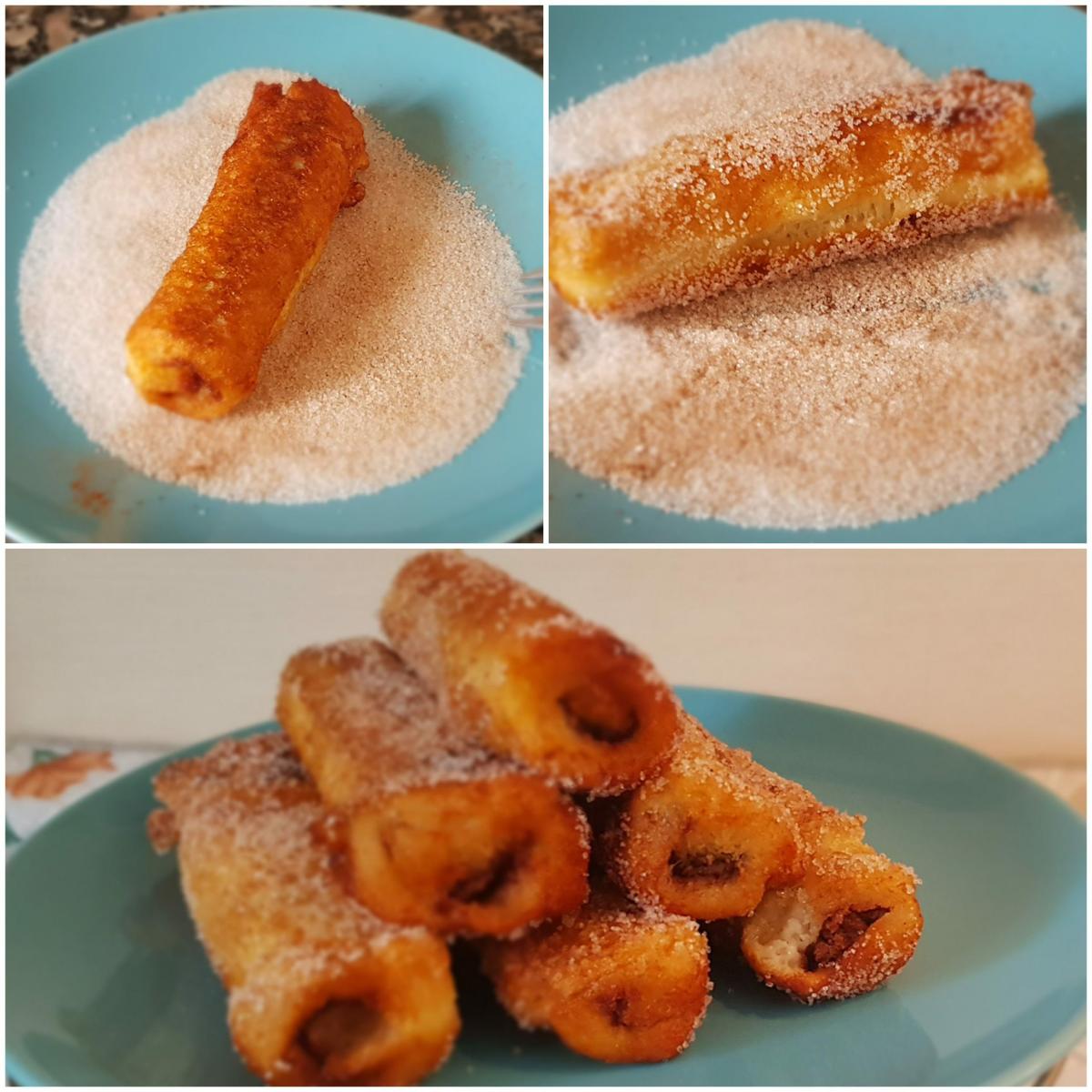Rebozar: Preparar en un plato 4 ó 5 cucharaditas de azúcar y una cucharadita de canela, y rebozar los rollitos cuando aún estén tibios, así se impregnará mejor el rebozado y vamos colocándolos en un plato.