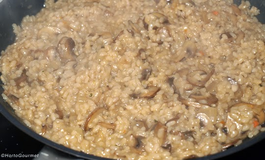 Después llegará el turno de las setas y los champiñones. Los añadimos y las hacemos al punto, es decir, hasta que pierdan prácticamente todo el agua. Salpimentamos también al gusto en este paso. La cantidad de sal dependerá un poco de lo salado que esté el caldo que hemos preparado.