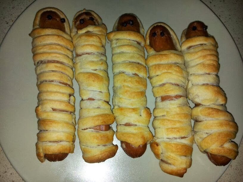 - Cortar el hojaldre en tiras finas e iguales y envolver las salchichas.