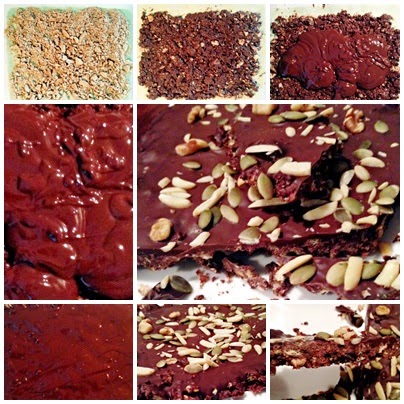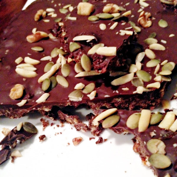 Desmenuza las galletas y extiende sobre papel de cocina. Funde chocolate al baño maría y mézclalo con las galletas uniformemente. Echa otra capa de chocolate, puedes alisarlo con ayuda de una espátula. Espolvorea los frutos secos al gusto y introduce en la nevera durante media hora. Y a disfrutar! Bon appetit!