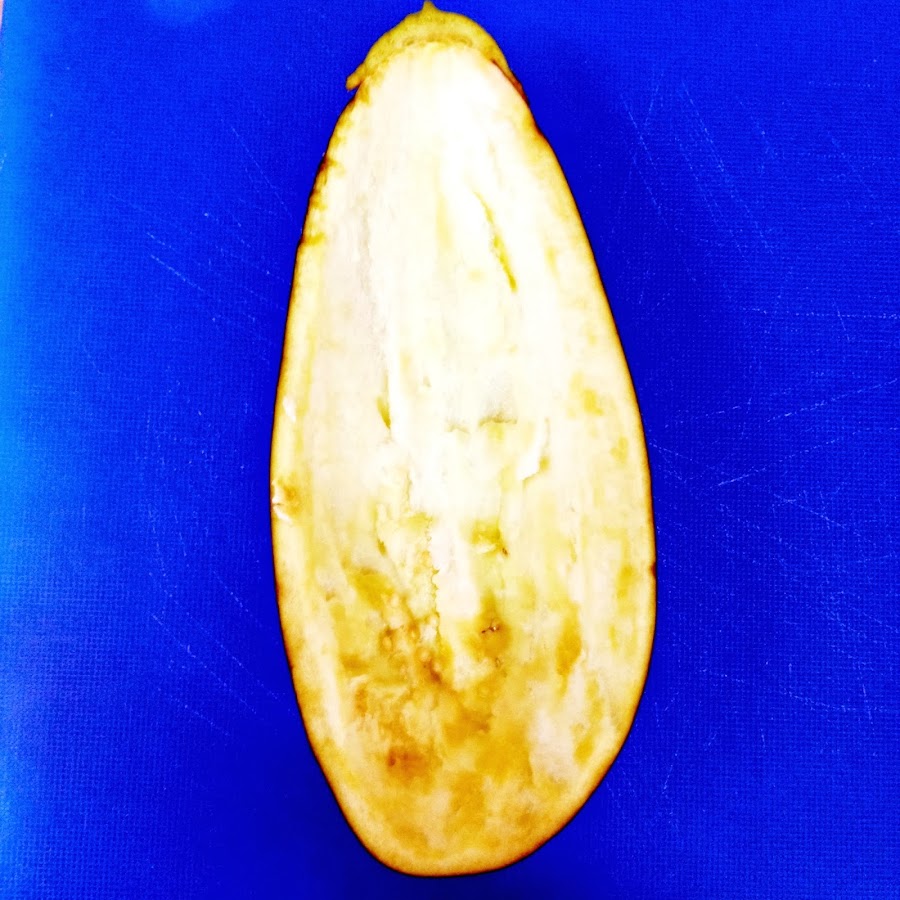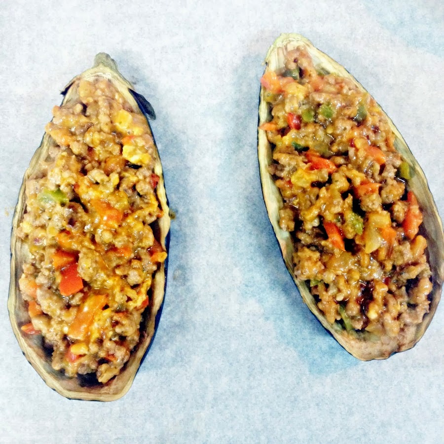 Limpia las berenjenas, córtalas por la mitad y retira la carne del interior reservando un poco para el relleno.