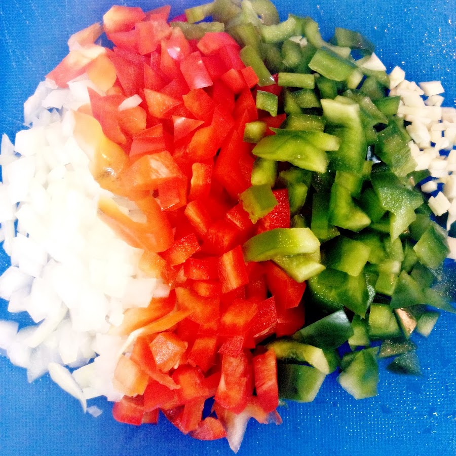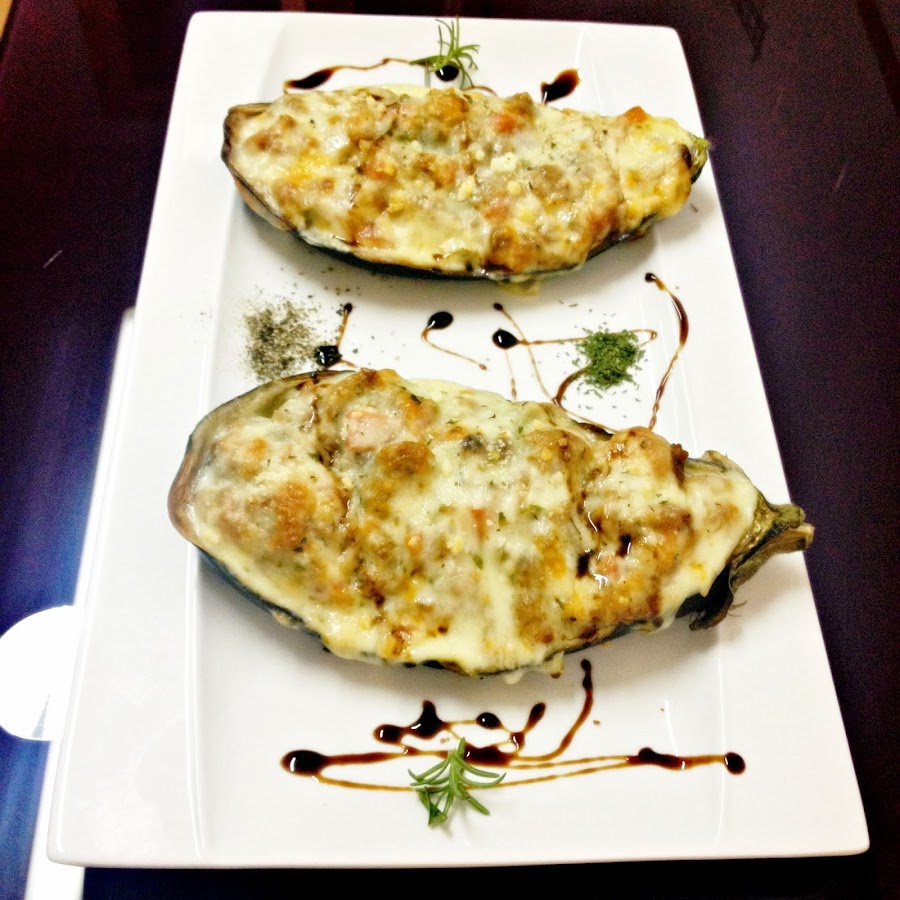 Pica la verdura (cebolla, 1 diente de ajo y los pimientos) finamente y pon a pochar en una sartén con aceite. Cuando esté bien pochada, añade la carne de ternera salpimentada y cocina brevemente. Agrega la carne de las berenjenas, espolvorea con perejil picado y mezcla bien.