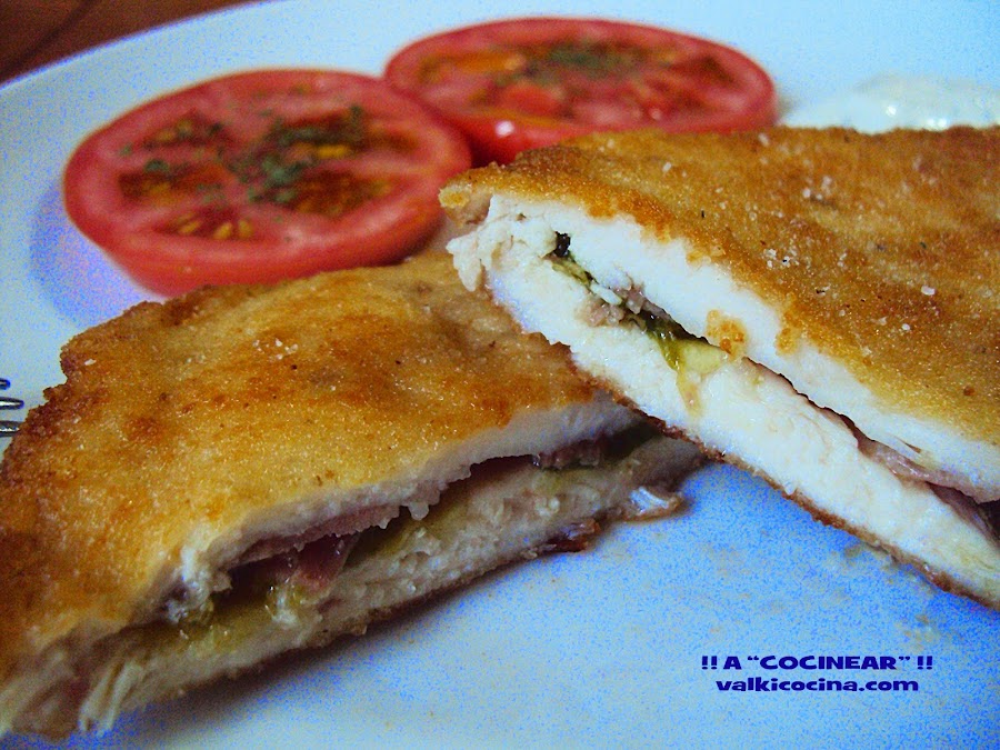 Escalope de pollo relleno de jamón york y pimientos. Esta rica receta nos la ofrece el blog A Cocinear. Mira que nos gustan las recetas de pollo, por que además de rico es muy económico. Y esta receta lo tiene todo.