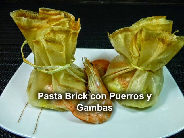 Saquitos de pasta brick con puerros y gambas. Un entrante delicioso, muy vistoso y fácil de hacer.