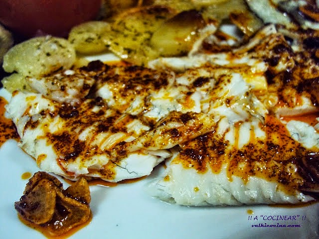 Otro pescado que nos da mucho juego en fiestas es el rodaballo. Es ideal por su casi ausencia de espinas, .. y en esta ocasión te propongo que lo hagas al horno con un delicioso refrito, ( te explico un "truqui" para comprobar que está en su punto .. ); .. y con la guarnición a la vez, .. que en esos días todo lo que sea ahorrar tiempo, nos viene genial.