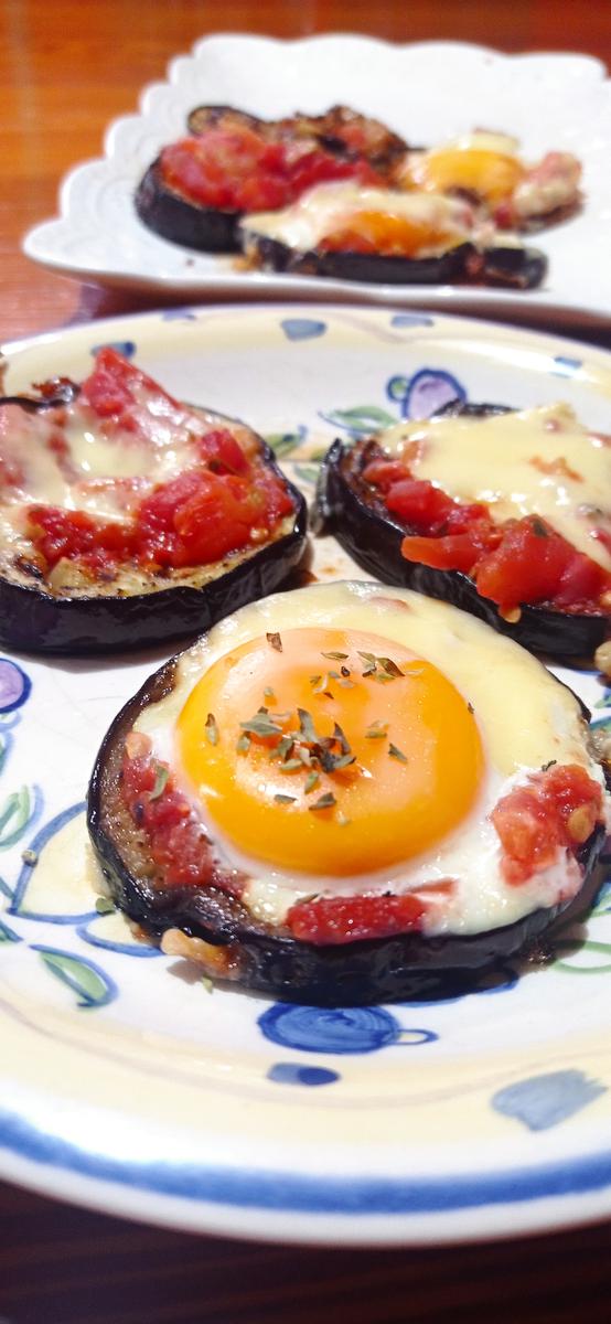 Es un acompañamiento y calculo una rodaja con huevo por persona y utilizo solo la yema para que no desborde de la berenjena pero podes usar el huevo entero y al resto le pongo salsa de tomate y queso cremoso.