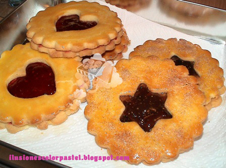 Untar una cucharadita de mermelada de higos o fresa en el centro de las galletas sin dibujo y tapar con las galletas que si tienen dibujo, quedando el dibujo coloreado por la mermelada.