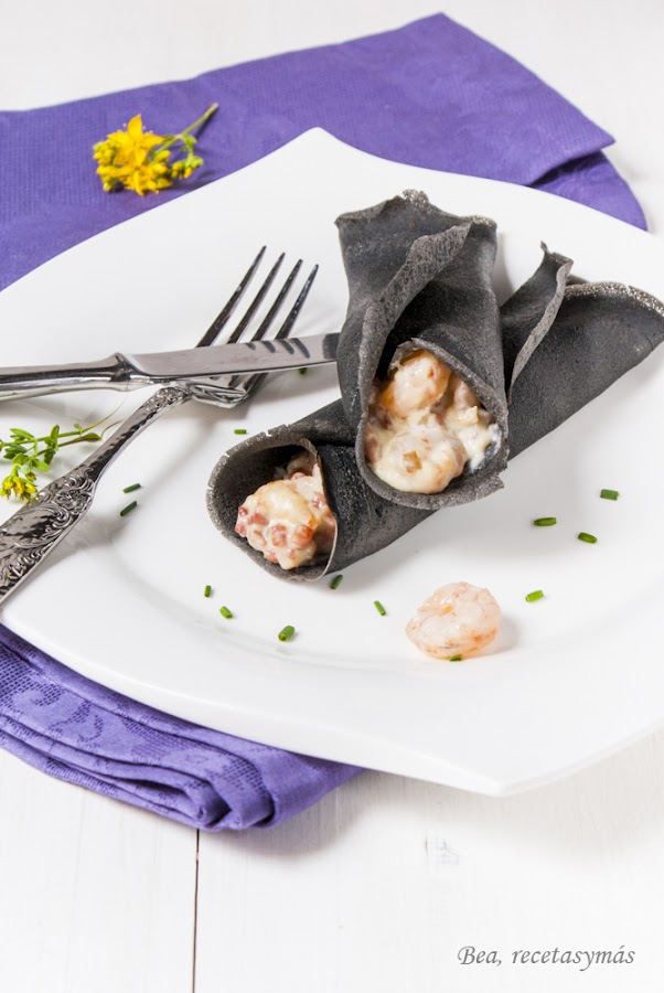 7) "BEA, RECETAS Y MÁS" nos trae un plato de diseño, y de lujo: "CREPES NEGROS RELLENOS DE GAMBAS Y JAMÓN":
