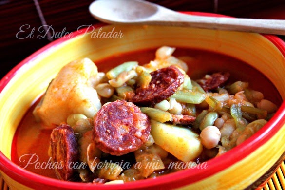 Necesitas: pochas, borrajas, chorizo, aceite...