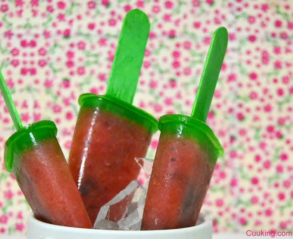Cuuking! Ha preparado estos Polos de sandía sin azúcar que, además de ricos, son muy graciosos pues imitan el aspecto de la sandía en sí. Necesitas sandía, gotas de chocolate y limón, entre otros ingredientes. Se mezcla todo, se coloca en moldes y se deja congelar.