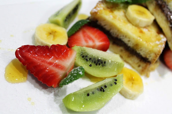Servimos calientes en un plato acompañadas de las frutas frescas cortadas en trozos, un poco de golden sysup y azúcar glass.
