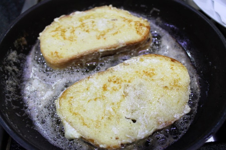 Ponemos una sartén al fuego con la mantequilla y el aceite y cuando esté caliente ponemos las tostadas y dejamos que se doren por ambos lados.