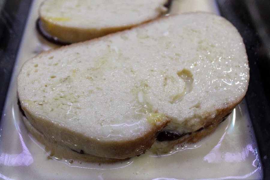 Pasamos los sándwiches rellenos de Nutella por la mezcla de huevos, leche y azúcar y dejamos unos minutos que absorba un poco .