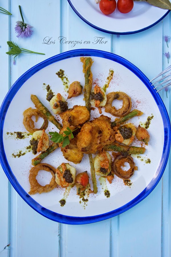 2. En un bol mezclar la harina con el agua helada y el pimentón ( picante o dulce según el gusto) hasta obtener una masa con una consistencia similar a una papilla. Sumergir los aros de cebollas, las puntas de los espárragos, los pimientos mini y los tacos de pulpo cocido. Cuando estén bien impregnados con la masa de tempura freír por ambos lados hasta dorar. Retirar sobre un plato cubierto con papel de cocina. Emplatar junto con las patatas cocidas y salsear con la mayonesa de pimentón y el triturado de perejil, ajo y aceite de oliva virgen extra. Servir bien caliente.
