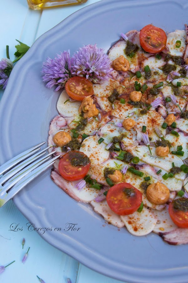 2. Con la ayuda de una máquina corta fiambres, ir cortando muy fino el rollo de pulpo congelado. Ir acomodándolo en el plato de presentación. Cortar el cebollino y espolvorearlo sobre el pulpo, lo mismo con las flores de cebollino. Trocear los tomates cherrys y colocarlos alrededor del plato.