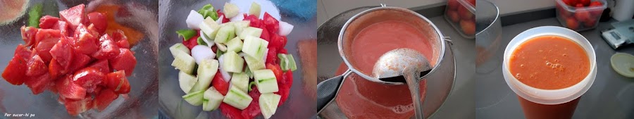 Ha llegado la hora de la comida, seguimos con la dieta de la sandía, y vamos a preparar del blog Per sucar-hi pa ,un Gazpacho de sandía que seguro que lo preparas mas de un día.