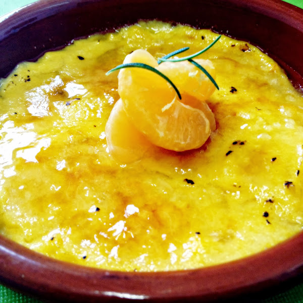 Make some juice with the 8 mandarines. Grate the mandarin peel and keep it. Take the segments out. Keep them. Mix the flour with 2 spoonfuls of sugar. Add a little stream of juice and continue mixing. Finally add the yolks and whip properly. Keep the mixture. Heat in a pan the rest of the juice with the zest. To avoid the lumps, when the juice starts to boil, pour a little to the previous mixture and stir properly. Put everything in the pan, put it on the stove and cook until it become thicker. Put the mixture in four containers and let it to cool down. Put some sugar on the centre of each one of them and burn the surface with a blowlamp. Put on top of it some mandarin segments and decorate with a little branch of rosemary. Let it to cool down and is ready to eat! Bon appetit!
