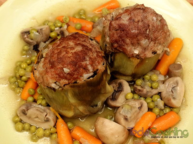 Noemí, de TodoCooking, ha preparado un plato andaluz tradicional y "que en mi casa se ha preparado desde siempre. Recuerdo a mi padre realizando las alcachofas o alcauciles (como en el Sur las llamamos) rellenas de carne en salsa de vino con mucho mimo, y siempre les salía estupendas y muy jugosas. El único añadido de mi cosecha han sido las verduritas de guarnición."