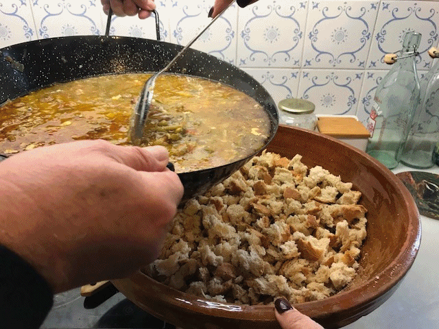 Estepona tiene dos patrones y dos fiestas populares, San Isidro y La Virgen del Carmen: labradores y marineros. Esta receta es del campo, y la hacemos el día del patrón. El 15 de mayo, se llenan las calles de gente que hacen sus chamizos o chozas y allí hacen la sopa campera y reparten con los vecinos y visitantes. Todo esto regado por una buena sangría o un vino de la tierra.