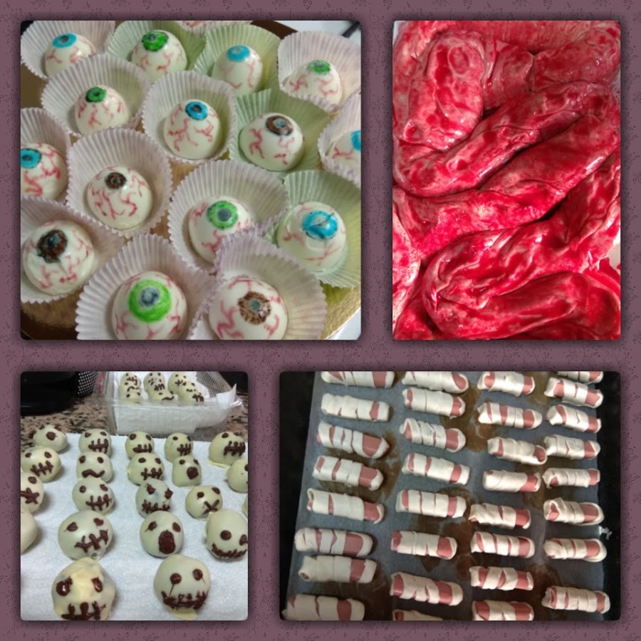 Ojos de zombi: estos ojos son muy sencillos,lo primero que tenéis que hacer es cocer unos huevos.Yo cocí ocho huevos y me salieron 16 ojos.Una vez cocidos,los pelamos y los partimos por la mitad,les quitamos las yemas y las dejamos en un plato a parte. Con las yemas,las chafamos y les ponemos un poco de mahonesa y un poquito de kechup. Mezclamos bien y esta mezcla la utilizamos para rellenar las claras que hemos dejado reservadas.Las ponemos en cápsulas de cupcakes y con ayuda de rotuladores de tinta comestible les pintamos los detalles del ojo.Como veis es rápido y queda bien para una merienda cena tétrica, jajajaj.