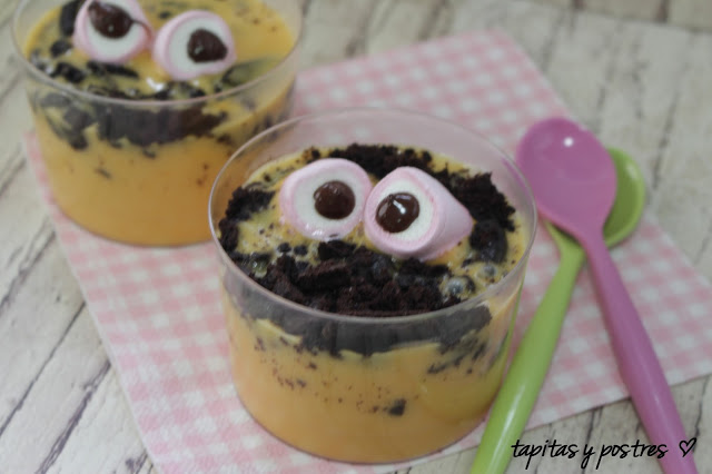Empezamos con unas divertidas natillas de calabaza que podréis encontrar en mi blog Tapitas y Postres. Primero vamos a preparar un puré de calabaza cocida y mezclar con leche, azucar, harina de maíz y un sobre de preparado para natillas. Lo llevamos al fuego para disolver y que espese la preparación. Vertemos en vasos y decoramos con migas de galletas y nubes. Os aseguro que los niños no notarán que están comiendo verdura.