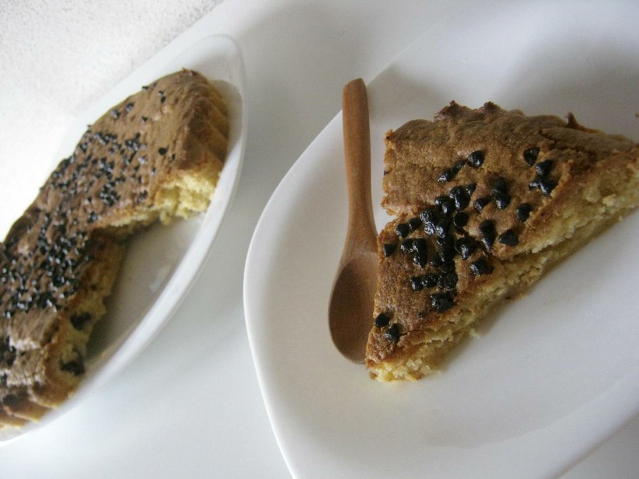 Decorarla con gotas de chocolate (hundirlas un poco sobre la masa) y llevadla al horno