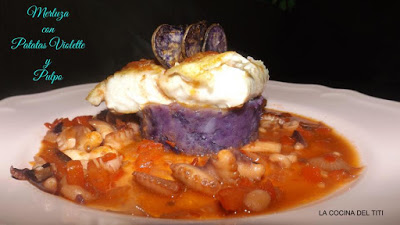 MERLUZA CON PATATAS VIOLETTES Y PULPO