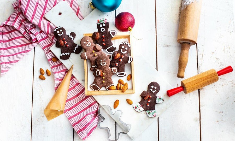 Elaboración: mezclamos la mantequilla con el azúcar y la sal. Añadimos la harina tamizada, el cacao y el jengibre, y seguimos mezclando. Cubrimos la masa y dejamos enfriar durante una hora en la nevera. Estiramos la masa sobre una superficie en la que habremos previamente extendido un poco de harina, y estiraremos hasta conseguir una masa de 5 mm de espesor. Cortaremos las galletas, las pondremos sobre una bandeja de horno, pondremos una almendra en el centro, cerraremos los brazos para simular que la abraza y hornearemos 12' a 170º. Por otro lado, mezclaremos el azúcar glas con el zumo de limón y decoraremos con ayuda de una manga pastelera.