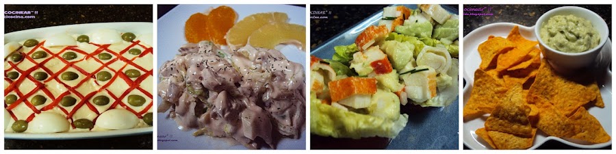 Todo un clásico que siempre gana por "goleada": la ensaladilla rusa, en este caso de las que se hacen facilitas y saben a las ricas tapas de los bares. Seguimos con una rica ensalada de pollo en salsa rosa, que con su contraste de sabores, no se puede quedar en el "banquillo". Otras dos opciones estupendas, vienen de la mano del aguacate: ensalada de aguacate y palitos de cangrejo con cogollos, que podemos servir en las hojas de los cogollos de lechuga, y que sea así muy fácil servirse; ... y por supuesto un imprescindible "fichaje" internacional como es el guacamole, y con el que vamos a disfrutar "dipeando", ( .. en este caso con doritos Tex Mex ).