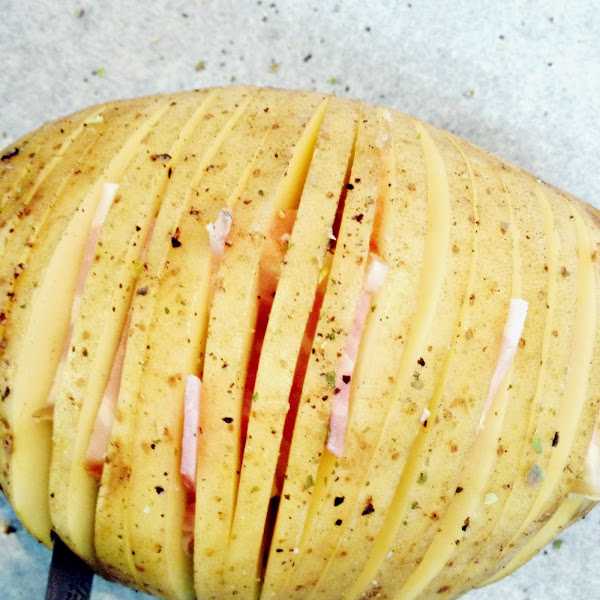 Cuando las tengamos todas introducimos en cada ranura un trocito de bacon, espolvoreamos la patata con tomillo, sal y pimienta negra.Introducimos en el horno a 200 ºC durante unos 40-50 minutos pero lo mejor es ir comprobando el grado de cocción pinchándolas cuando se cumpla el tiempo. Si se prefiere se puede añadir un poco de aceite de oliva por encima de la patata antes de introducirla al horno.