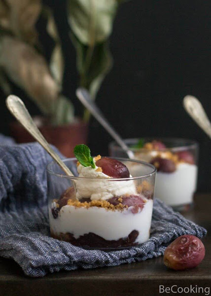 Vasitos de crema de queso y yogur, uvas asadas y crumble de almendra de