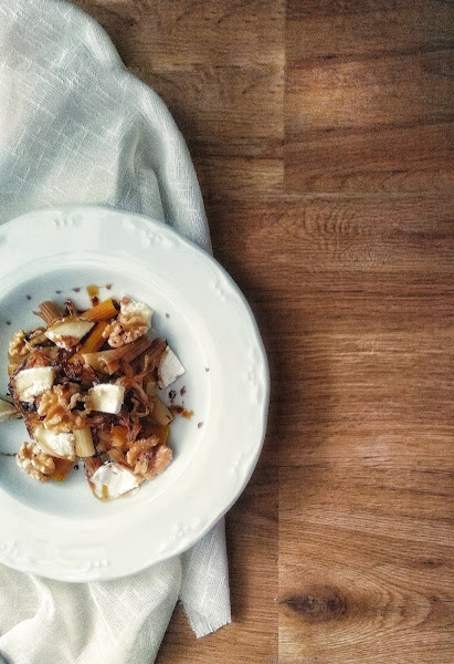 PLATO ÚNICO - MACARRONES MULTICEREALES CON CEBOLLA CARAMELIZADA, QUESO DE CABRA, NUECES Y MIEL DE CAÑA