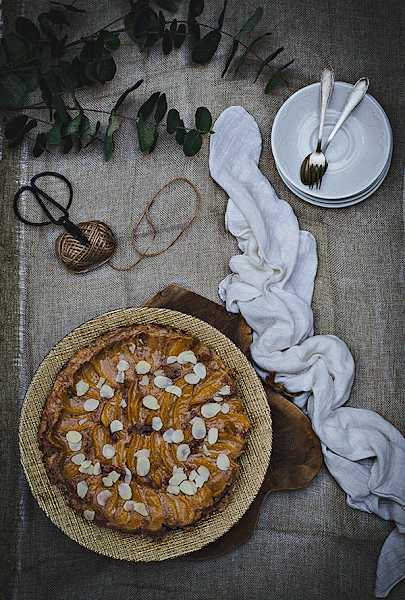 5⃣ Una vez fría, desmolda, pinta la superficie con la mermelada de manzana y pon unas almendras laminadas por encima.