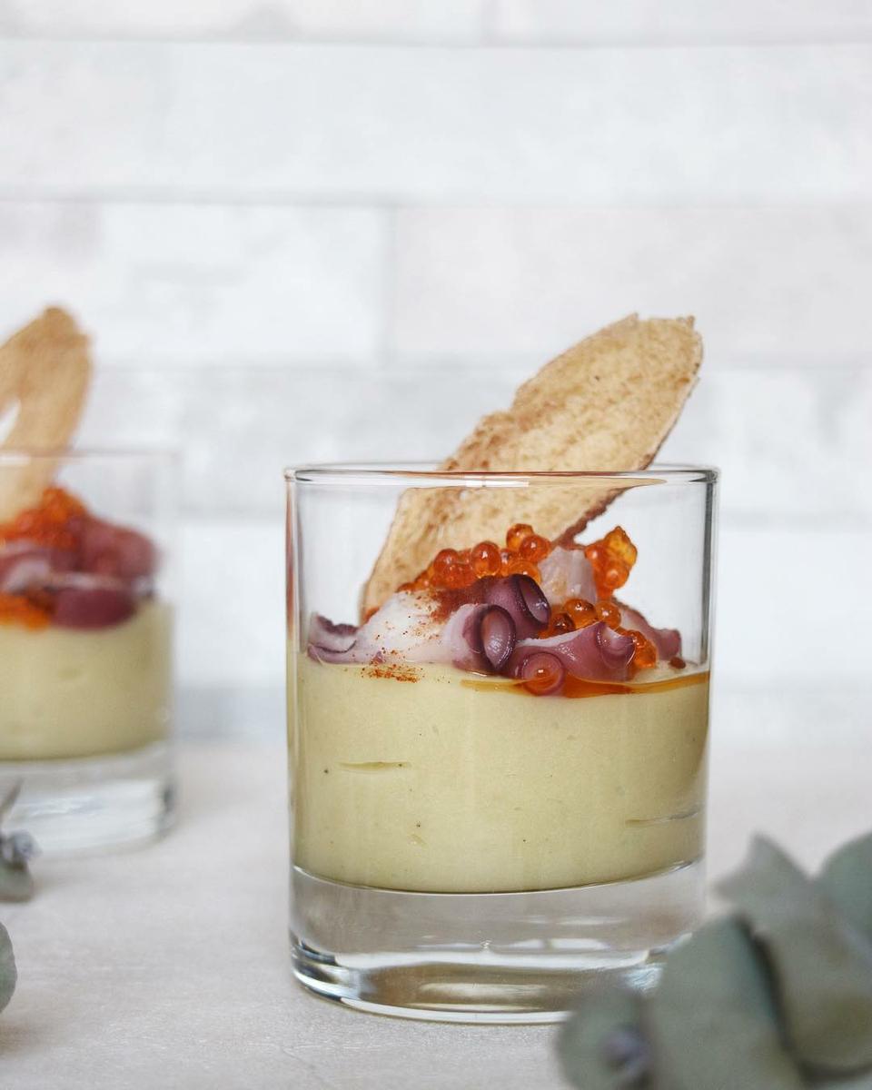 Vasitos de crema de pisto, huevo de codorniz y crujiente de jamón