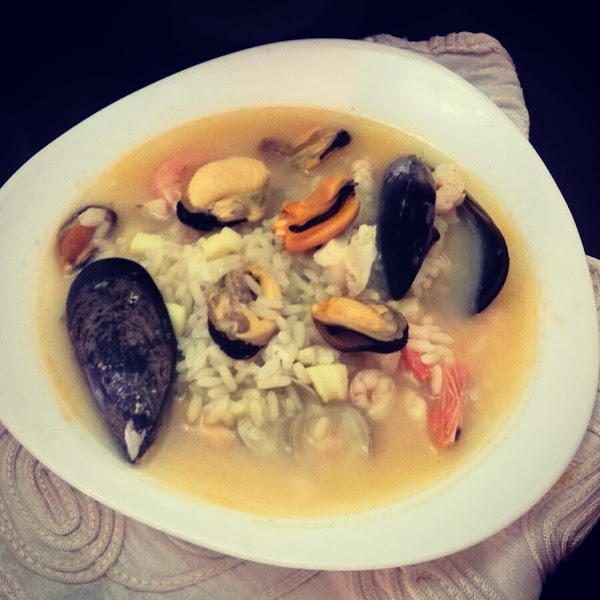Como ya va llegando el fresquito y apetece cuchareo, Sonia, del blog La magia de Sonia se ha decidido por una sopa de arroz con marisco. Lo del marisco fue en honor de sus suegros que les visitaban ese día en casa, ¡quedaron encantadísimos! Lógico.