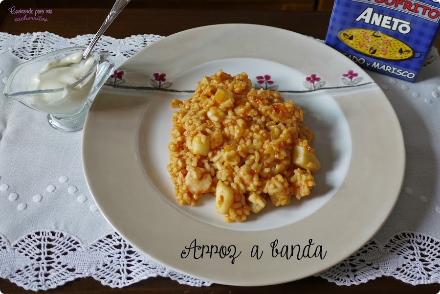 Desde la costa alicantina, Verónica, del blog Cocinando para mis cachorritos, nos trae un plato típico de pescadores. Con los mismos ingredientes, se sacaban dos platos: el primer día solía comerse un arroz a banda como este y, al día siguiente, con el mismo caldo y el pescado, se cocinaba un guiso a base de patatas.