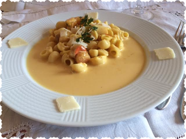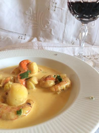También de la película "Sin reservas" es la magnífica salsa de azafrán que ha preparado Estela del blog La cocina de Estela y que nos presenta con vieiras y con pasta, para tener donde elegir.