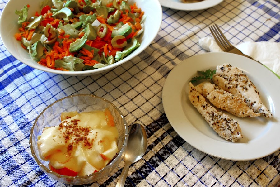 Un fantástico menú inspirado en la película "A tres metros sobre el cielo" es lo que nos ha preparado Débora del blog Hay un recuerdo en en mi plato: Ensalada mixta con aguacate y frutos secos, pollo a la plancha con finas hierbas, miel y limón y una macedonia de frutas con crema de vainilla