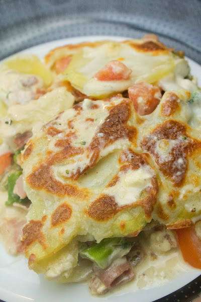 Esta diferente y deliciosa manera de preparar el pastel de patata es la propuesta de El Baúl de las delicias: Pastel de patata relleno de verduras y jamón a la carbonara